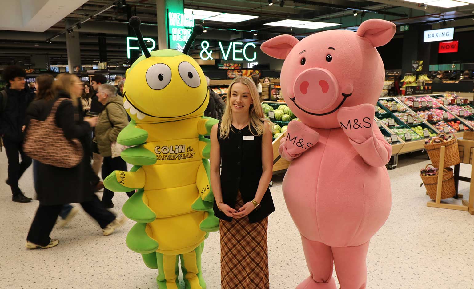 Store manager Natalie Jordan with Colin the Caterpillar and Percy Pig | Photo © Bath Echo