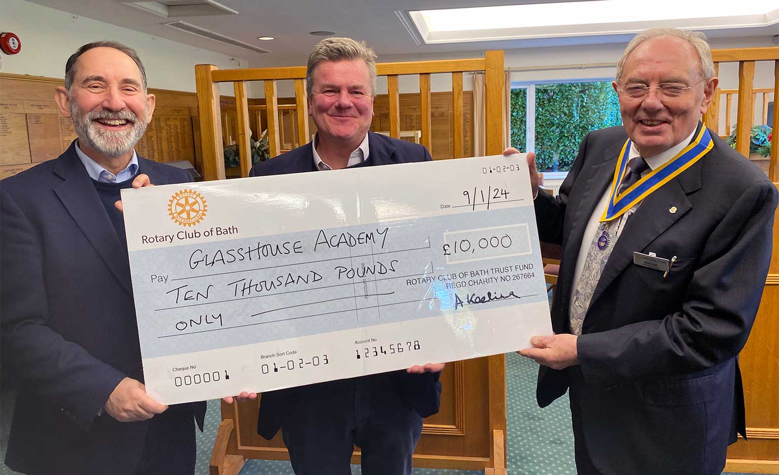 Allan Gait and Chris Davies presenting a cheque to Mark Cadbury | Photo © Rotary Club of Bath