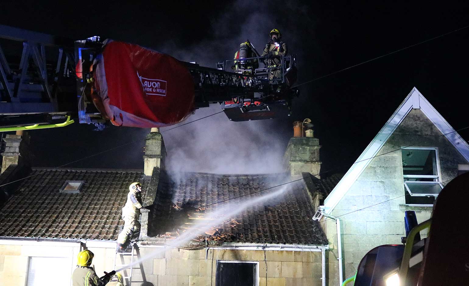 Firefighters on the turntable ladder fighting the fire through the roof | Photo © Bath Echo