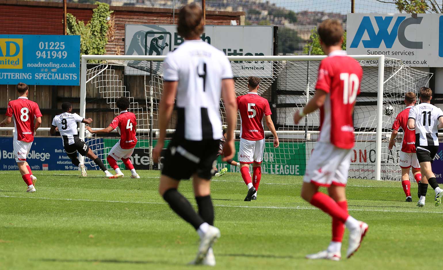 The Robins’ first real effort on goal came in the 82nd minute. With Bath custodian Harvey Wiles-Richards out of his box after clearing an attack, the Bristol centre-forward tried his luck but shot wide.