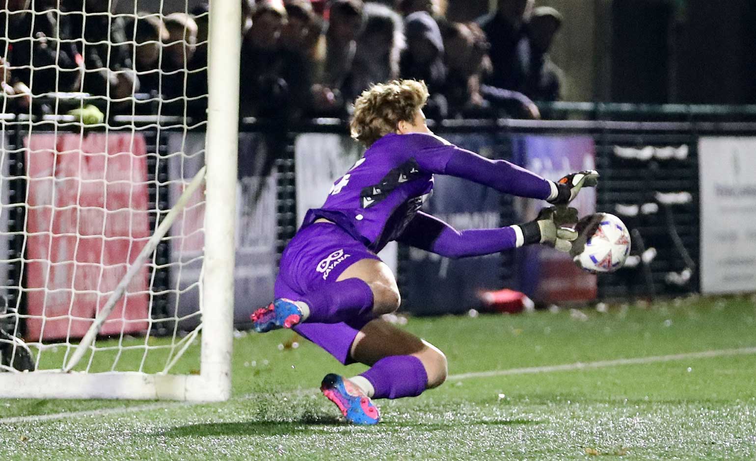 Bath City keeper Charlie Binns saves Charlie Carter’s penalty at Meadowbank Stadium on Saturday 13th December | Photo © Simon Howe
