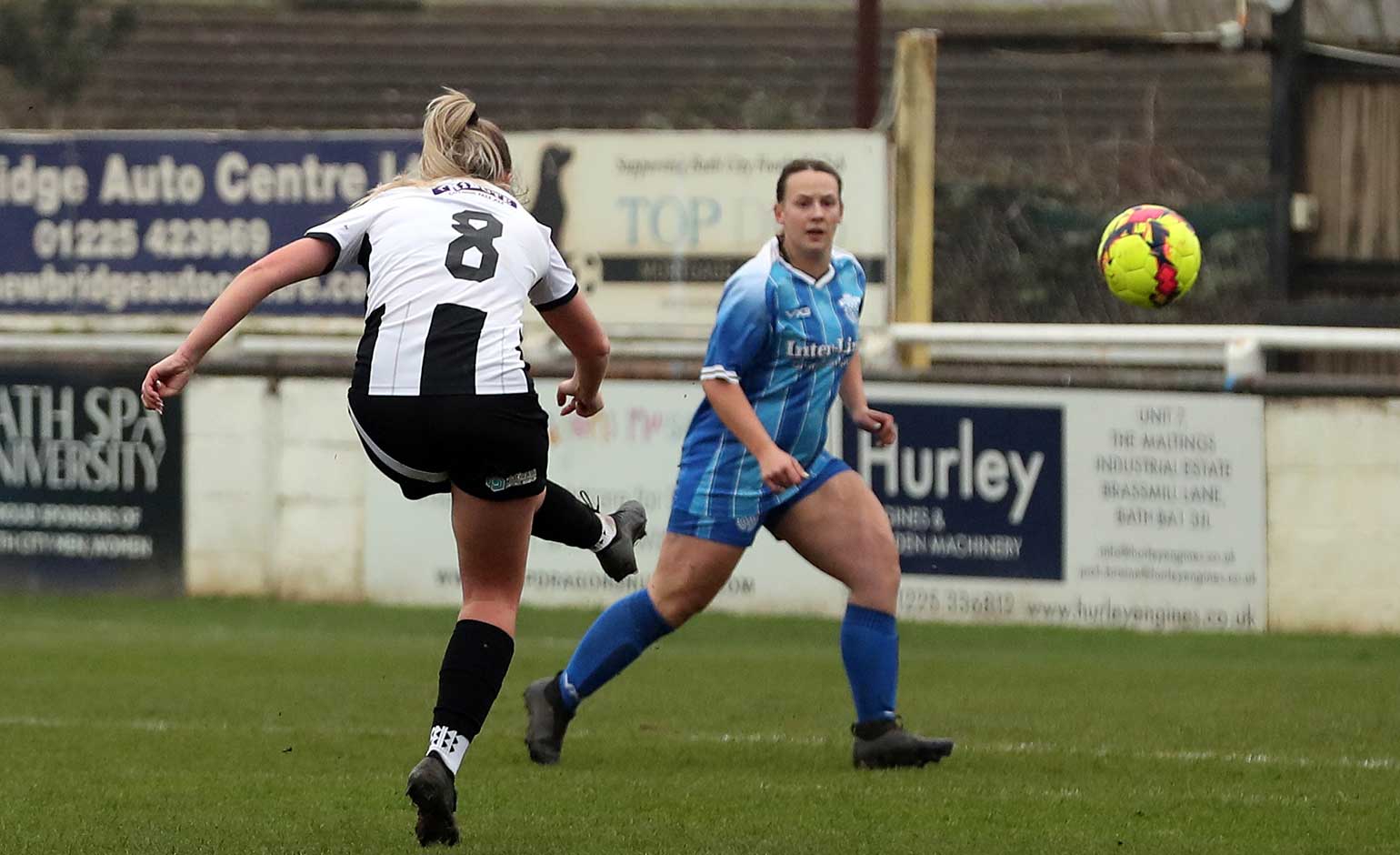 Maddy Brown lets fly from 25 yards to hand Bath City Women a 2-1 lead against Feniton Women at the Cannon Clarke Stadium @ Twerton Park | Photo © Simon Howe