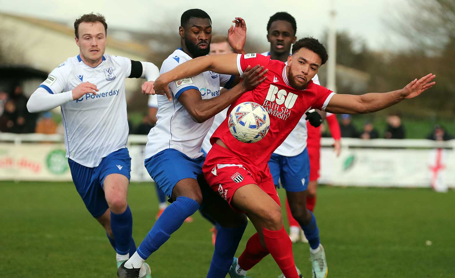 Bath City’s Donovan Wilson tussles with a posse of Enfield Town players during the Enterprise National League South game at the Dave Bryant Stadium | Photo © Simon Howe