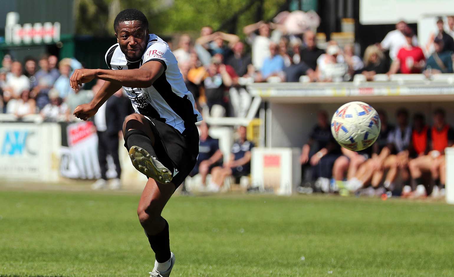 Scott Wilson bangs in his and Bath City’s second goal against Maidstone United at the Cannon Clarke Stadium @ Twerton Park on Saturday 25th April | Photo © Simon Howe