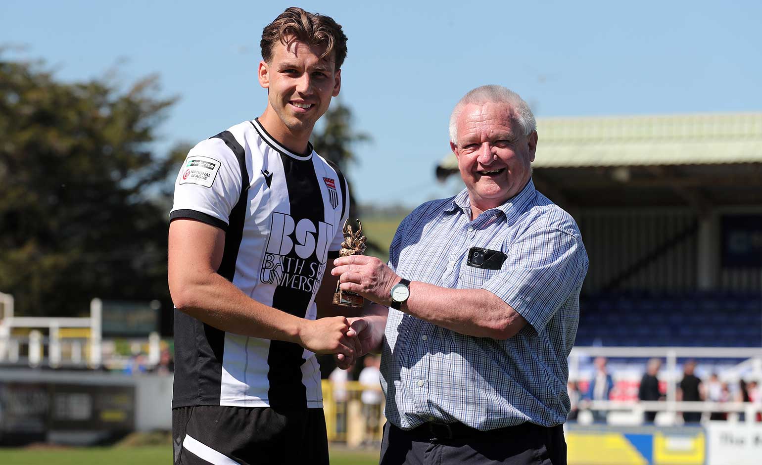 Defender Joe Raynes receives Bath City’s players’ player of the year trophy for 2025-26 after the match against Maidstone United. It was one of three awards presented to the former Larkhall Athletic and Odd Down player | Photo © Simon Howe