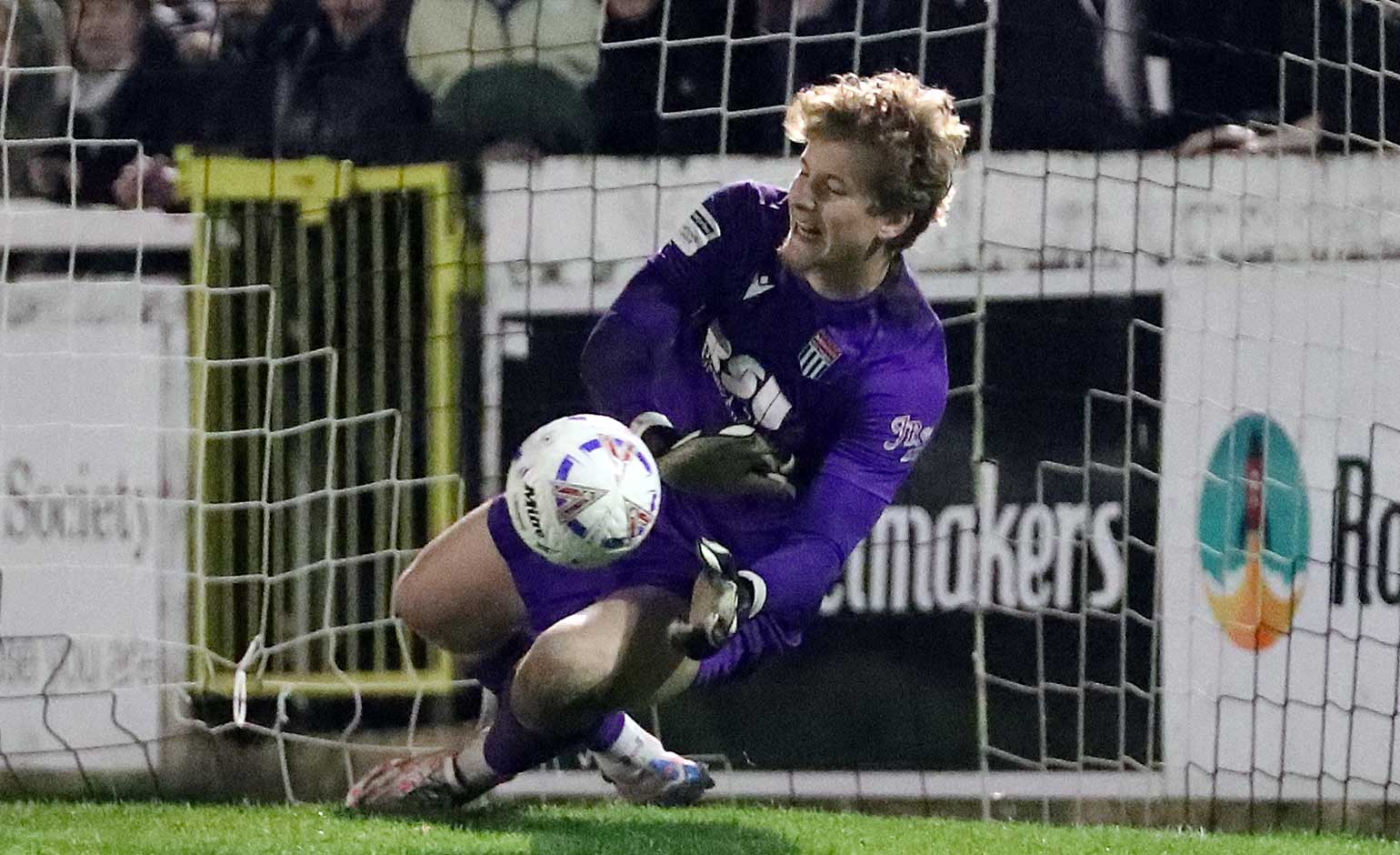 Charlie Binns saves from Max Herbert during the penalty shootout which Bath City won 5-3 to progress in the Isuzu FA Trophy at the expense of Bracknell Town | Photo © Simon Howe