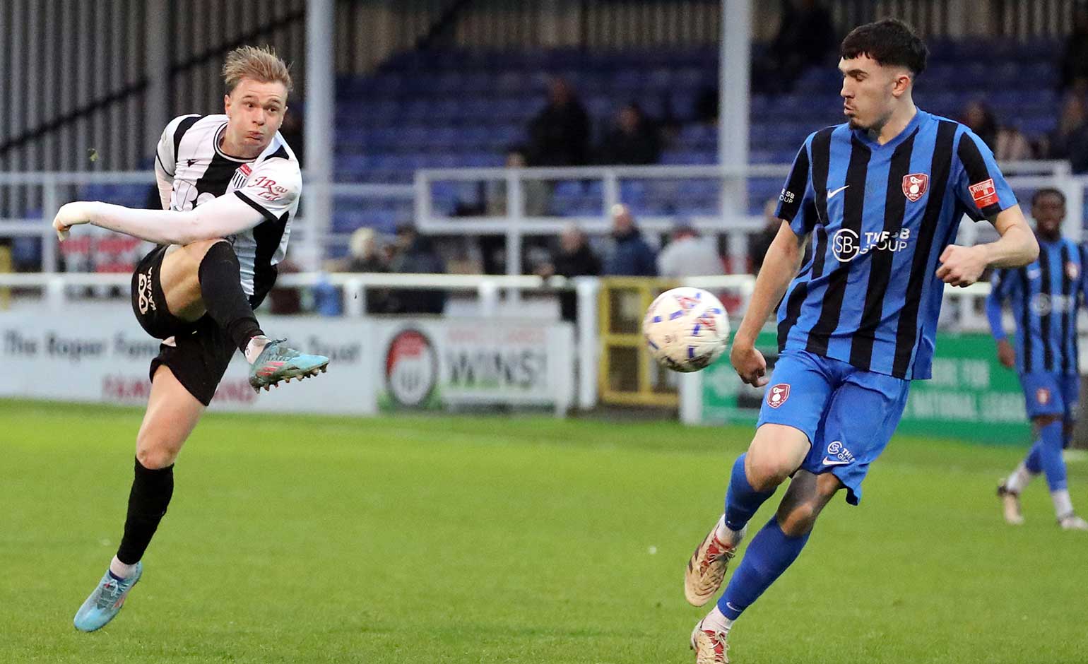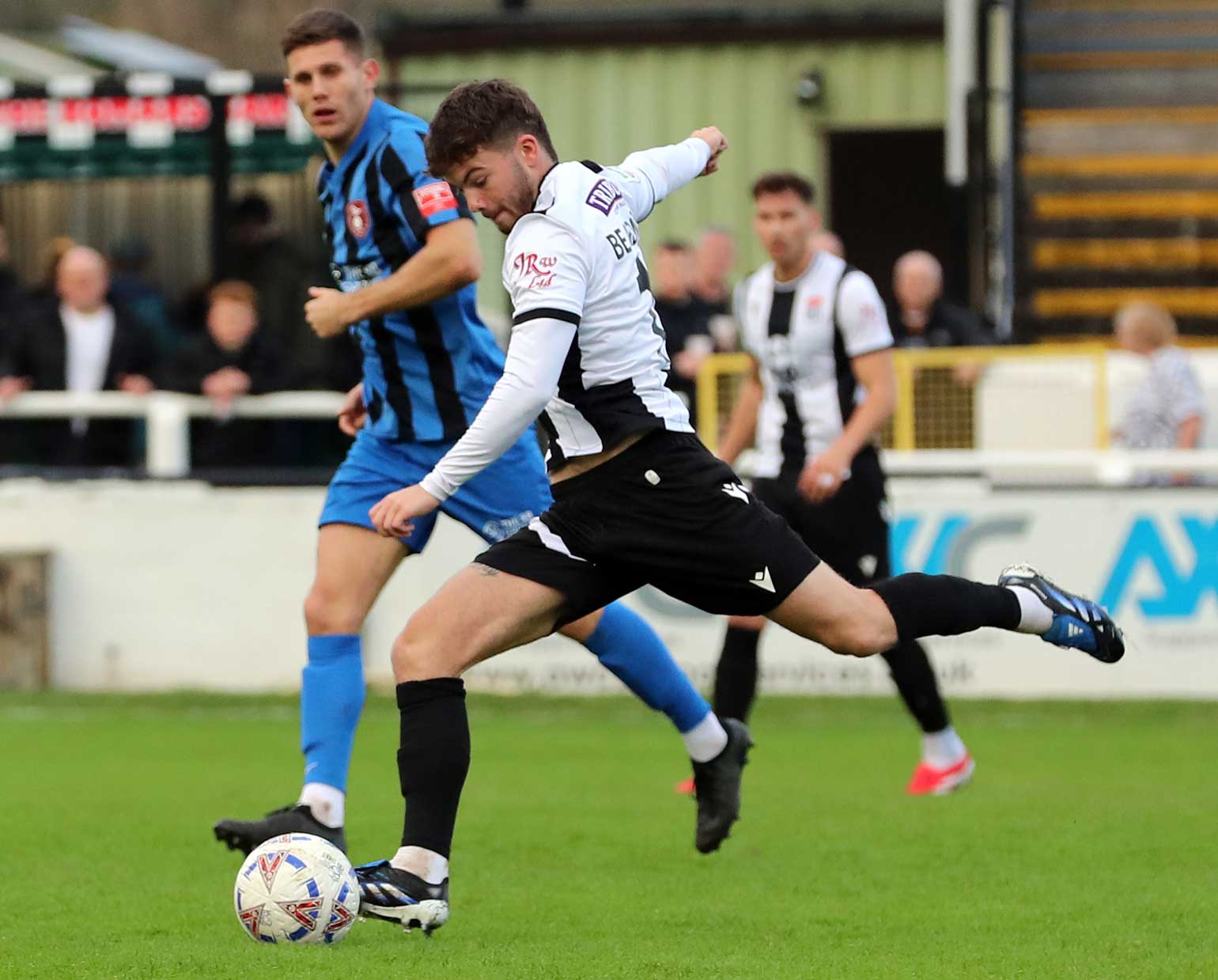 Bath City’s Will Jenkins Davies goes for goal during the Isuzu FA Trophy clash with Bracknell Town | Photo © Simon Howe