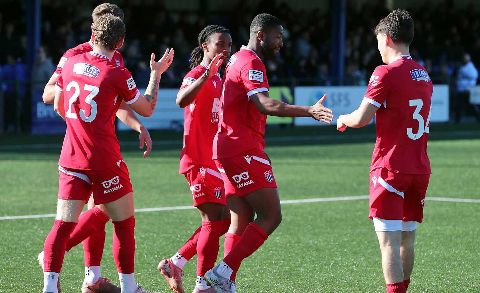 Scott Wilson, second right, is congratulated by team-mates after putting Bath City ahead at Tonbridge Angels | Photo © Simon Howe