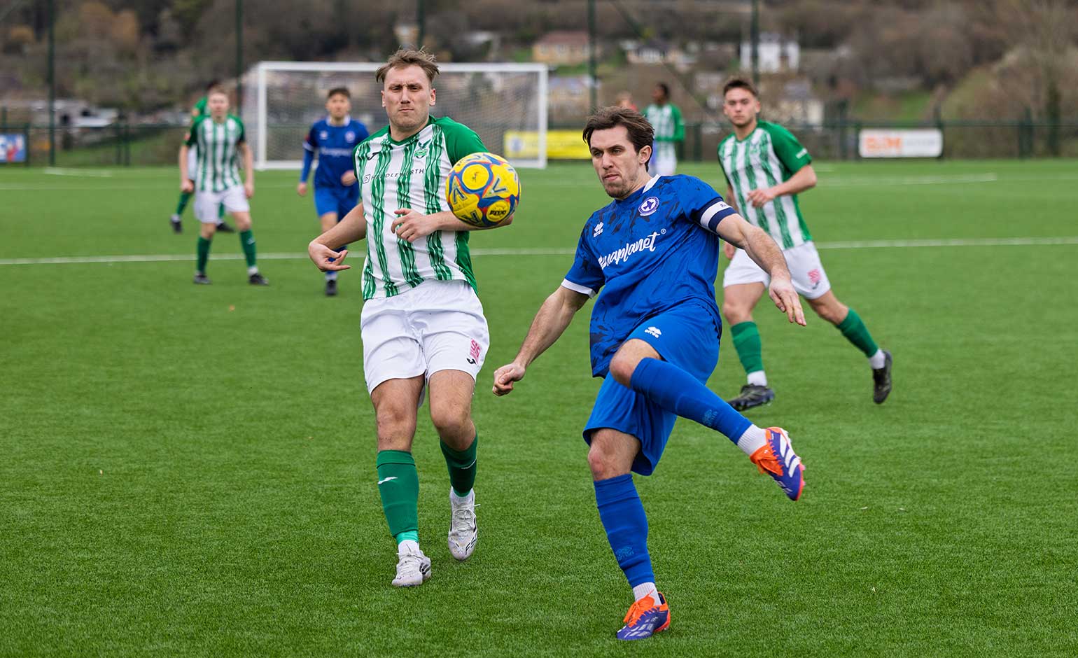 Larkhall Athletic captain Sam Boulton in control during the home victory over Sporting Club Inkberrow | Photo © Phil Scovell