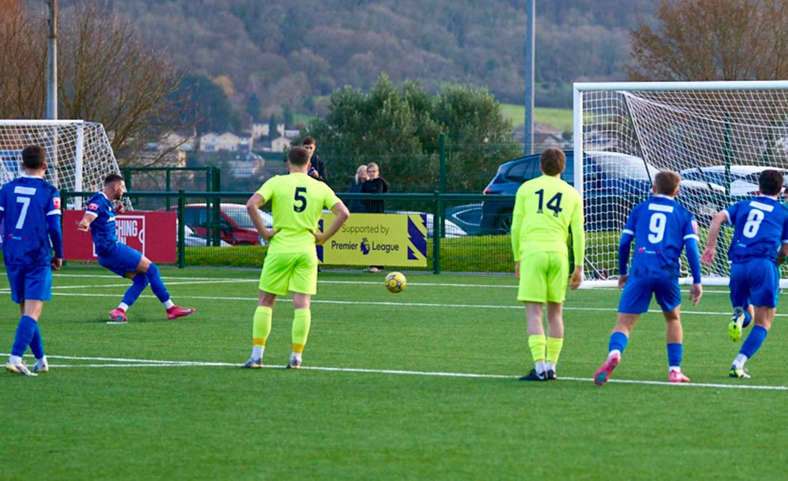 David Regula scores from the spot to hand Larkhall Athletic a 2-0 lead over Bishops Cleeve on Saturday 13th December | Photo © jeremyrichardsphotography.com