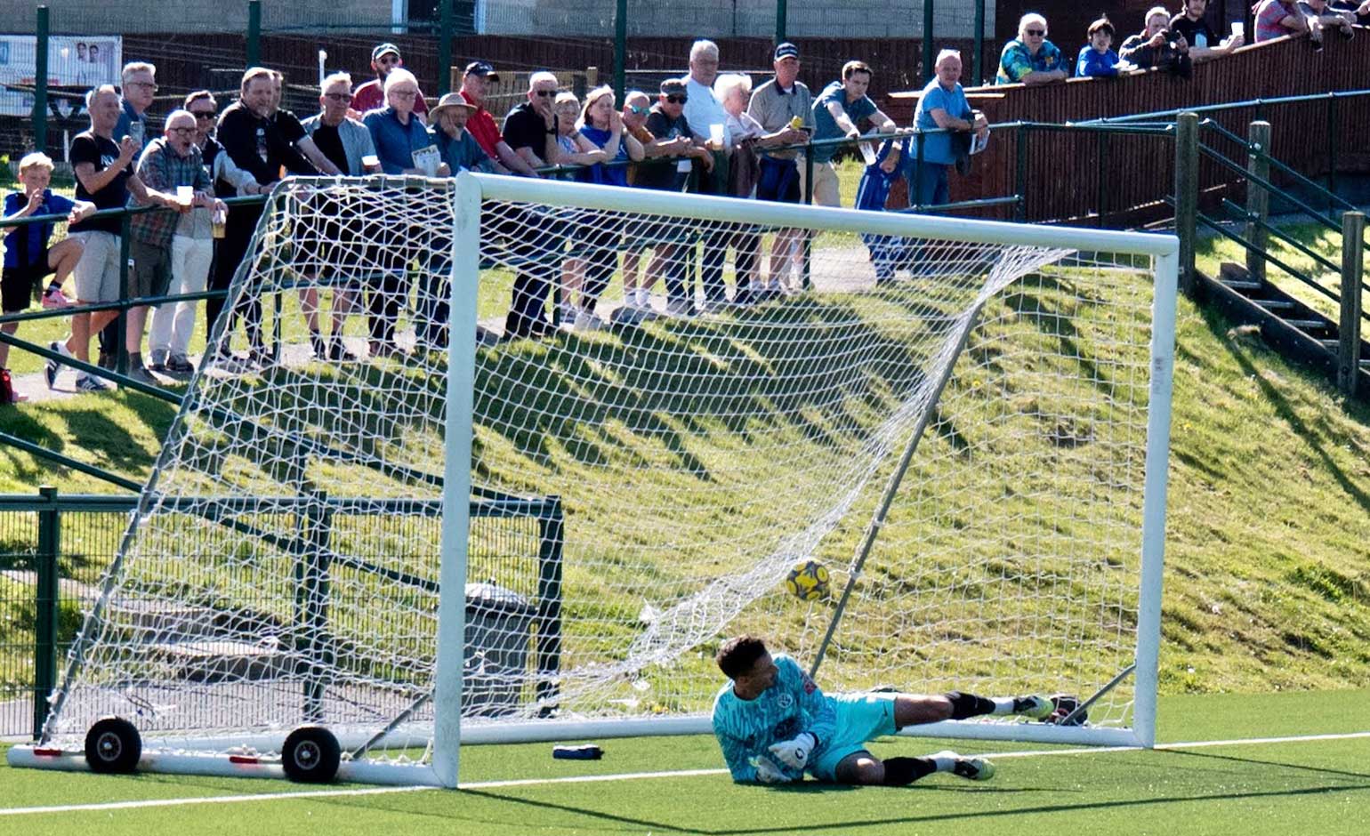 Alex Camm’s effort goes into the Mousehole net to hand Larkhall Athletic the lead at the Camella Stadium on Saturday 25th April | Photo © Liz Bugg