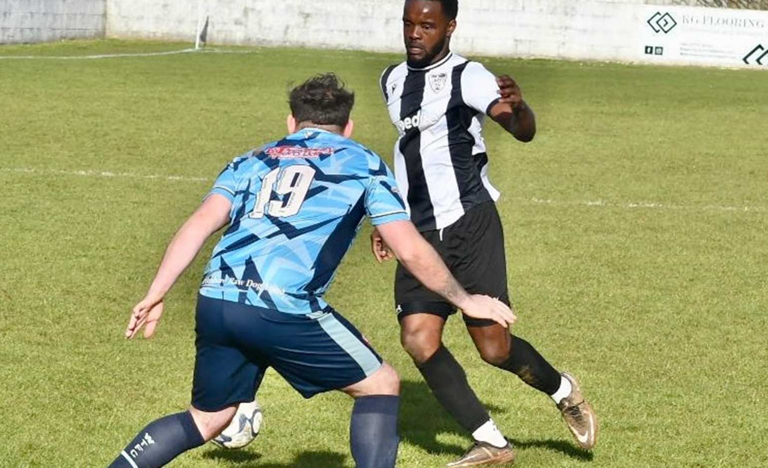 Odd Down’s Treyvond Anderson takes on a Warminster Town player at the Lew Hill Memorial Ground on Saturday 28th March | Photo © Odd Down FC
