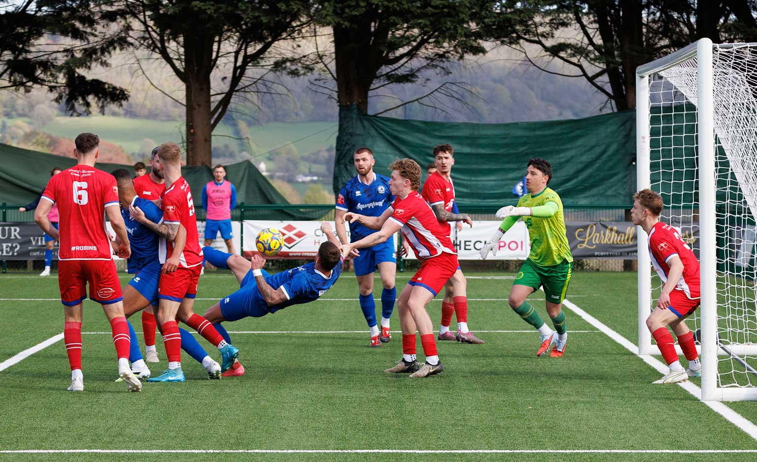 Dawid Regula goes for goal in acrobatic fashion during Larkhall Athletic’s 1-1 draw with Bideford on Saturday 11th April | Photo © Phil Scovell