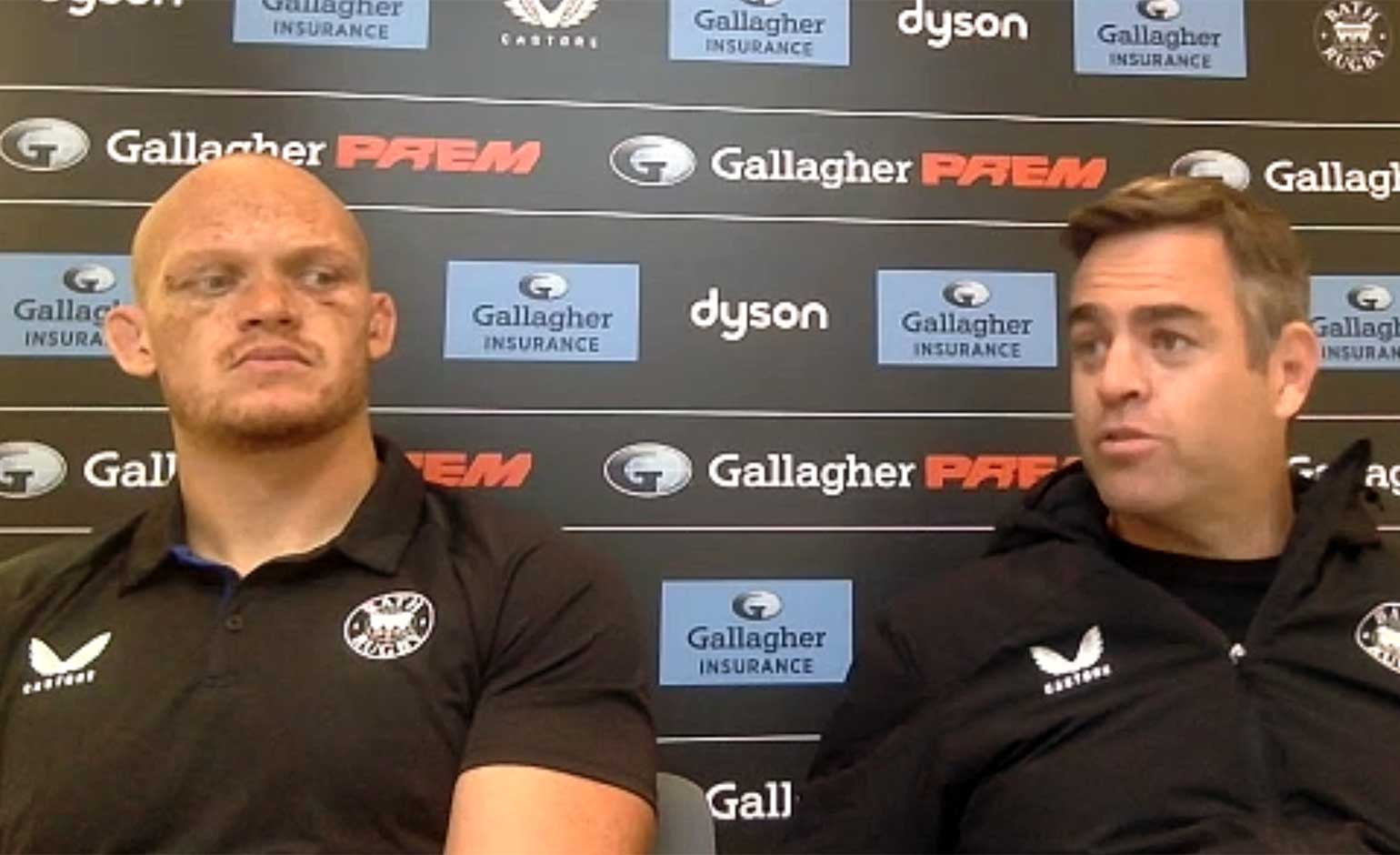Bath Rugby back row Miles Reid, left, and head of rugby Johann van Graan at the club’s pre-Sharks press conference this week | Image © Bath Rugby