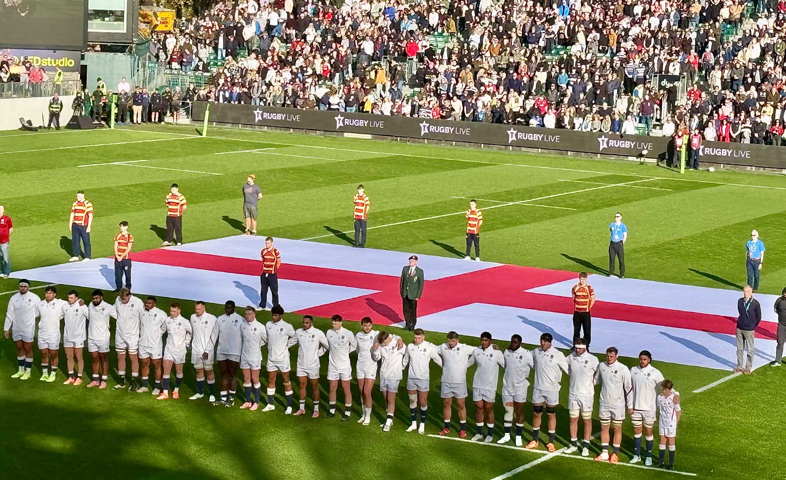 England A on the pitch at The Rec during the playing of The Last Post before their game against the All Blacks XV | Photo © Richard Briggs