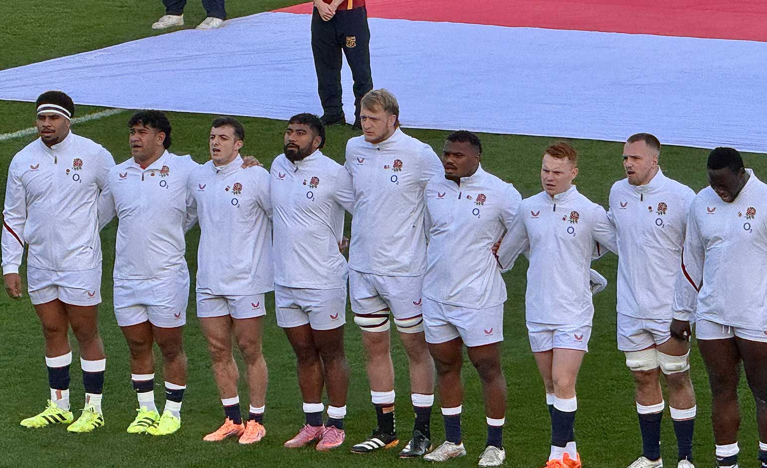 Bath Rugby’s Vilikesa Sela, left, and Kepu Tuipulotu, second left, sing the national anthem before England A’s match against the All Blacks XV at The Rec in November. The duo have now extended their Bath deals until 2028 | Photo © Richard Briggs